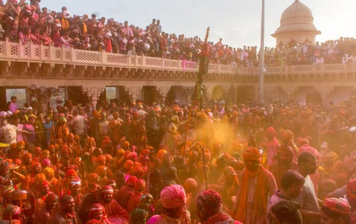 गुलाल-फूलों से आसमान- श्रीकृष्ण जन्मभूमि पर हुई भव्य लठामार होली